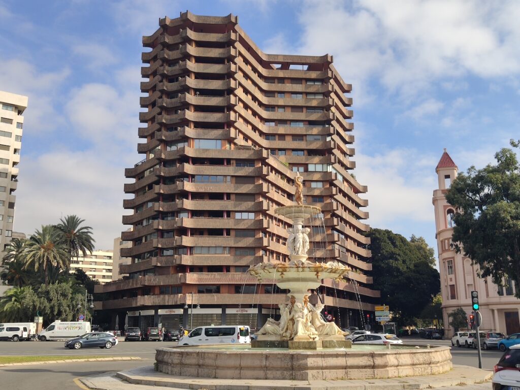 Diseñada en 1967, empezó a construirse en 1969, finalizando las obras en 1973. El entonces pujante estudio de arquitectura EVV (Antonio Escario, José Vives, José Antonio Vidal) fueron los encargados de proyectar esta majestuosa edificación de reconocida influencia japonesa, destinada a albergar viviendas de lujo de la burguesía local. Fue, de hecho, el primer edificio de València con aire acondicionado general (que hubo que individualizar por vivienda pasados un par de años). Según contaban en este artículo de Las Provincias, cuenta con dos plantas fantasmas, totalmente vacías, en su parte superior. Pero, sin duda, una de las cosas que más llama la atención es que su imponente fachada varía de apariencia según el reflejo de la luz sobre los ladrillos.