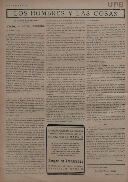 Desde los tiempos en que las tanguistas de los cabarets pedían a gritos a los camareros, un papelito de cocaína o se refugiaban en los reservados con sus amigos, para consumir un frasco de pantopón o de éter, es la barriada de Gracia lonja de la terrible droga, clandestino almacén de! tóxico criminal.